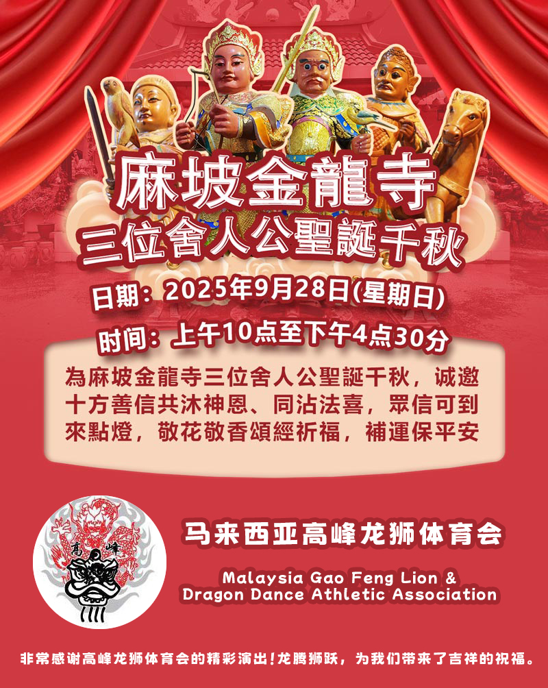 金龙寺谨定于农历初七(九月二十八),隆重举行三位舍人公圣诞千秋庆典,诚邀十方善信共沐神恩、同沾法喜。此次圣诞法会将举行诵经祈福、供灯祝圣等仪式,祈愿风调雨顺、国泰民安,更愿众善信阖家安康。